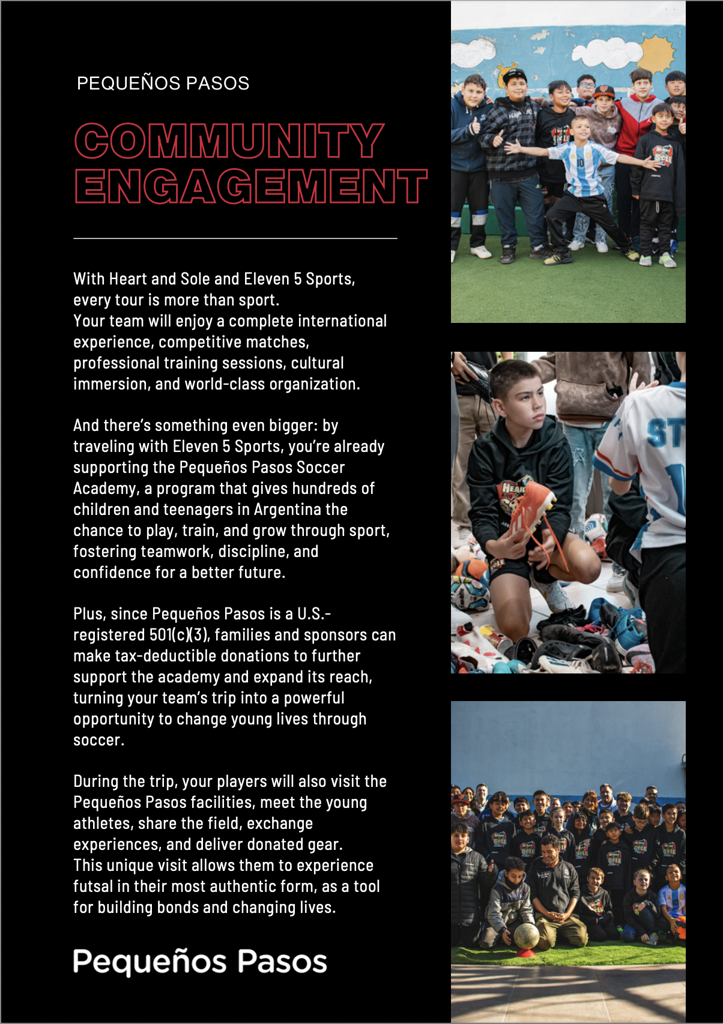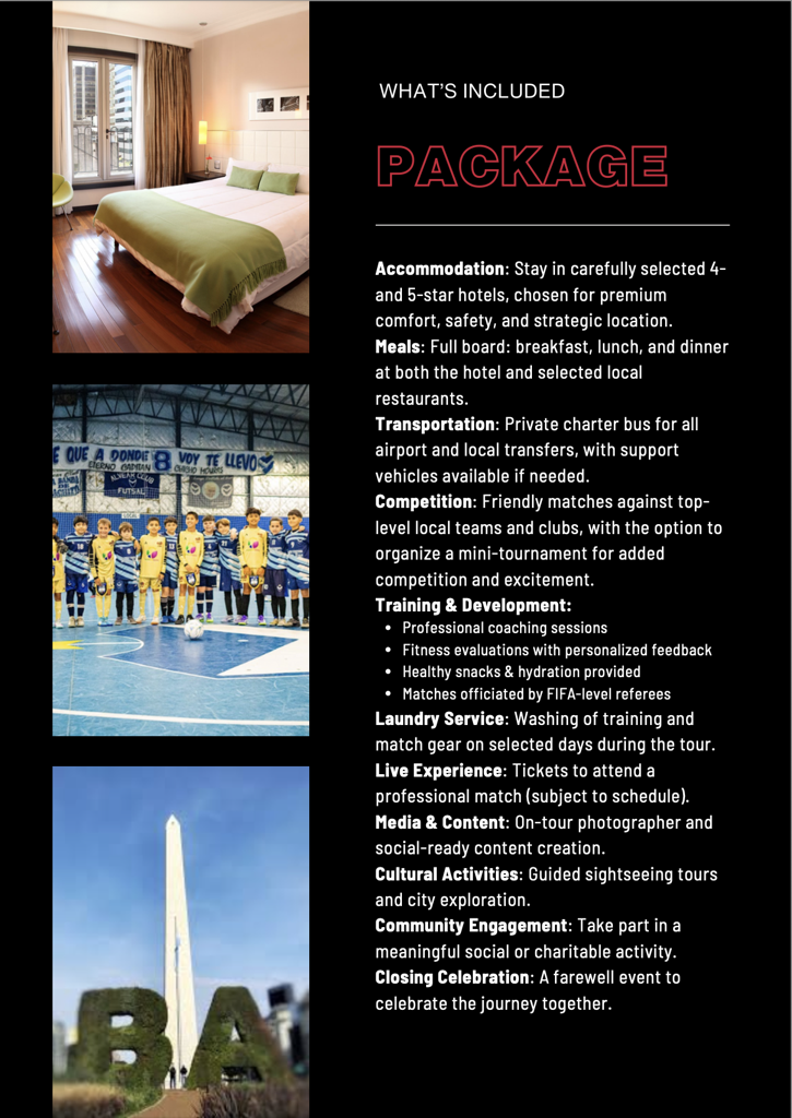 THE PACKAGE INCLUDES FIRST CLASS ACCOMMODATIONS AT THE 725 CONTINENTAL HOTEL IN THE HEART OF BUENOS AIRES. ALL GROUND TRANSPORT. 4 MATCHES AGAINST SOME OF THE BEST FUTSAL CLUBS IN ARGENTINA, TOURS OF ICONIC SOCCER STADIUMS, ATTENDANCE TO PROFESSIONAL FUTSAL MATCHES, TRAINING SESSIONS WITH COACHES OF TOP PROFESSIONAL TEAMS, AUTHENTIC ARGENTINIAN MEALS, CULTURAL TOURISM AND A HIGHLIGHT OF OUR VISIT IS A TRIP TO PEQUENOS PASOS WHERE WE DELIVER SHOES AND APPAREL AND OUR PLAYERS INTERACT AND PLAY WITH THE UNDERPRIVILEGED CHILDREN OF THE LOCAL BARRIO. OUR GROUPS ARE ACCOMPANIED BY TALENTED BILINGUAL LIAISONS THROUGHOUT THE TOUR. ADULT ACTIVITIES ARE ALSO SCHEDULED IN THE EVENINGS AS REQUESTED. IT IS A MEMORABLE AND FUN-FILLED WEEK PACKED WITH FUTSAL, SOCCER, FOOD, ARCHITECTURE, MUSIC AND TANGO IN ARGENTINAS BEAUTIFUL CAPITAL CITY!