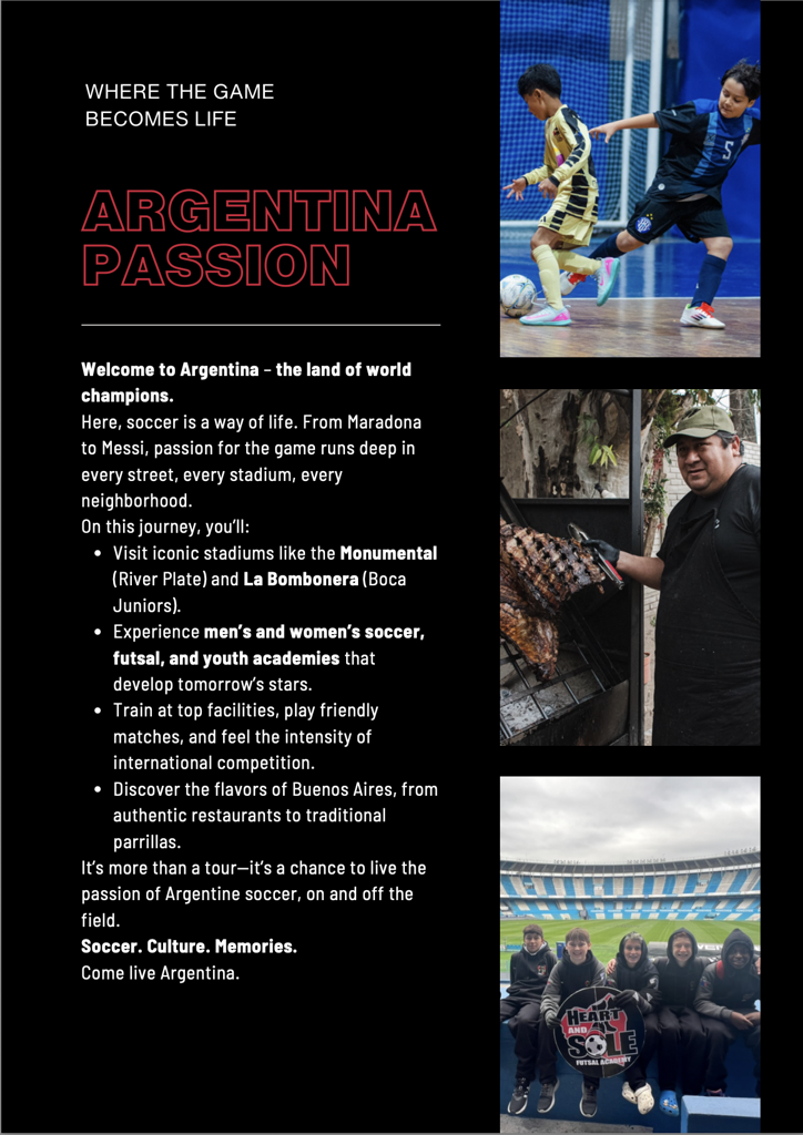 SINCE 2016 HEART & SOLE FUTSAL HAS BEEN COLLABORATING WITH SOME OF SOUTH AMERICAS MOST DISTINGUISHED FUTSAL CLUBS, PARTICULARLY IN ARGENTINA. BOCA JUNIORS, RACING CLUB, SAN LORENZO, FERRO CARRIL OESTE, PACIFICO, OLD BOYS AND MORE ON THE SCHEDULE WHEN WE VISIT. TOURS OF ICONIC SOCCER STADIUMS, ATTENDANCE TO PROFESSIONAL FUTSAL MATCHES, TRAINING SESSIONS WITH THE HEAD COACHES OF TOP PROFESSIONAL TEAMS ARE ACCOMPANIED BY ACTIVITIES WITH OPPOSING TEAMS, AUTHENTIC ARGENTINIAN BARBECUES, CULTURAL TOURISM AND MUCH MORE.